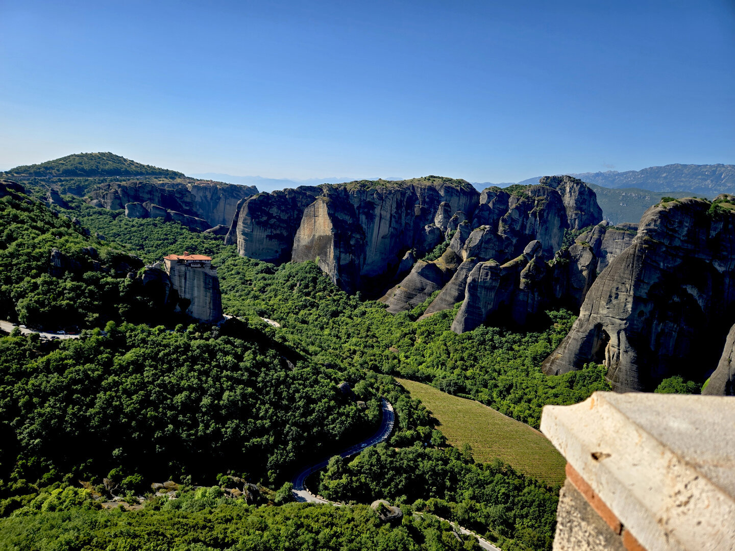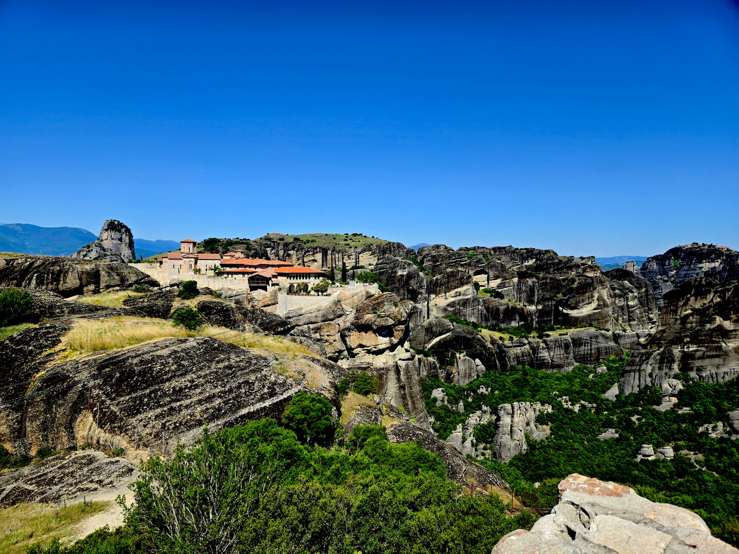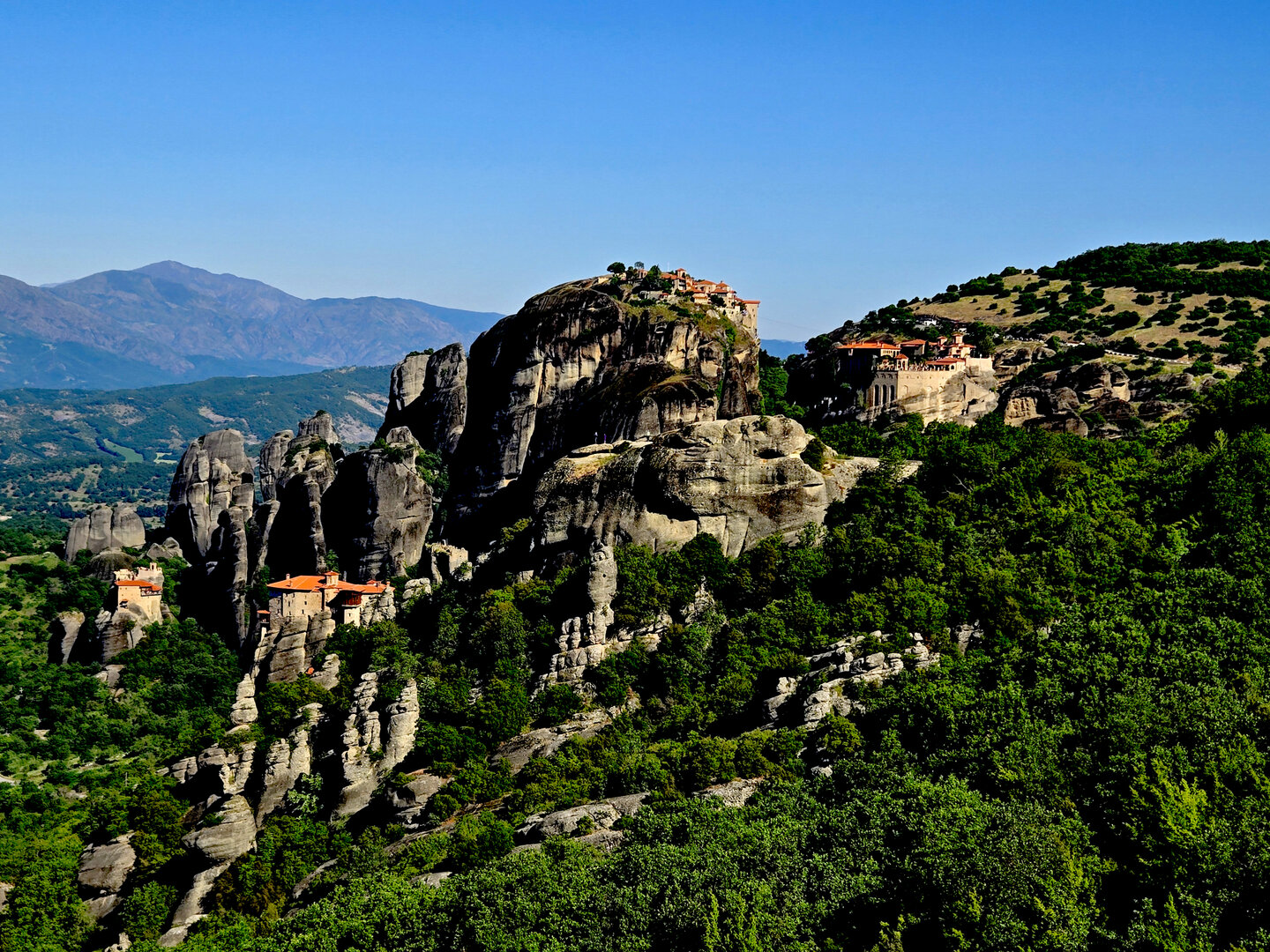 On to Meteora.  Meteora means "suspended in air" and the description and meaning couldn't be more apropos.  Eastern Orthodox monasteries built hundreds of feet high, on top of bizarre rock formations,   Also known as "Monasteries in the Sky".  It is hard to comprehend how some of these were built and how they got the building materials up there, but there they are.