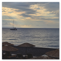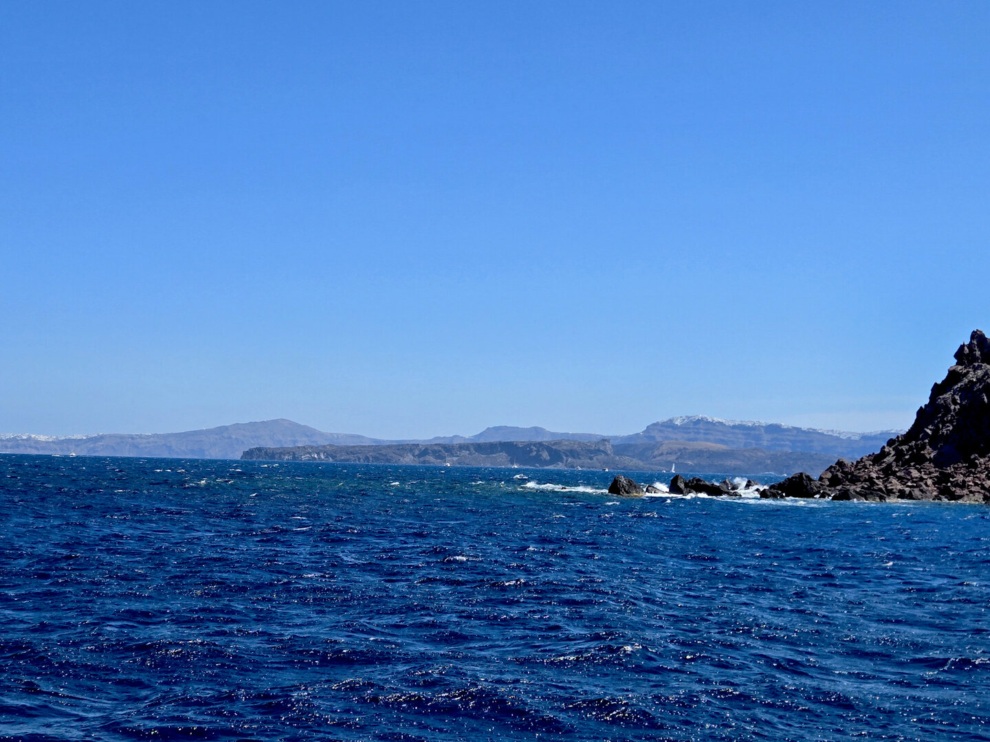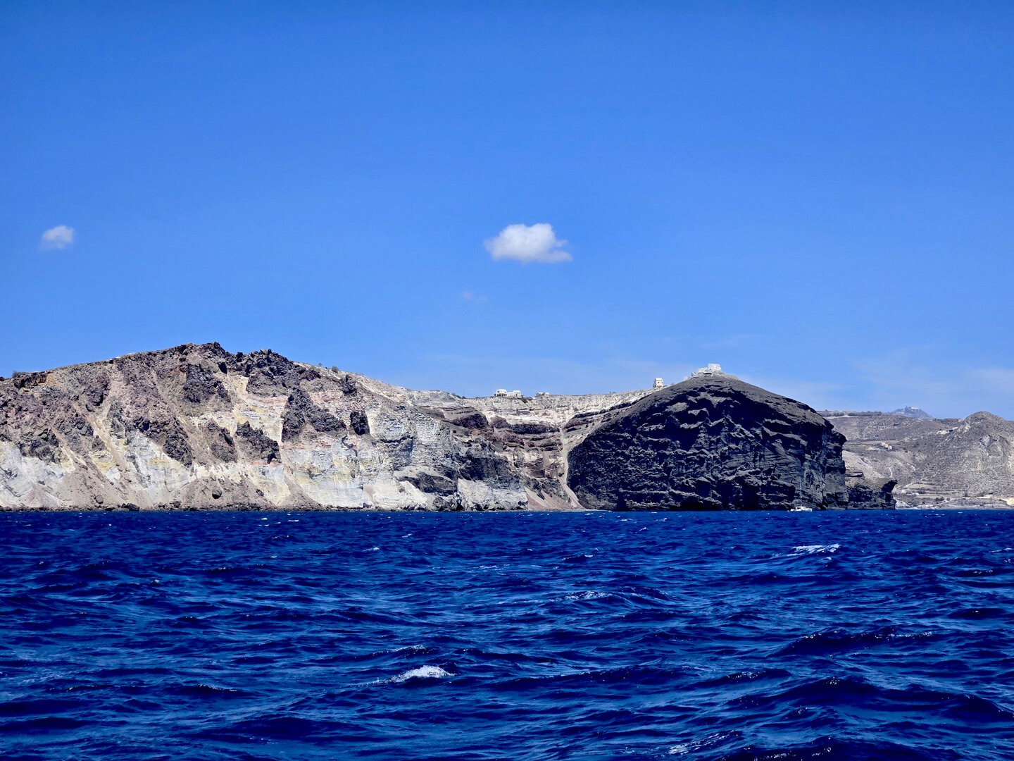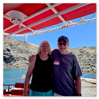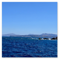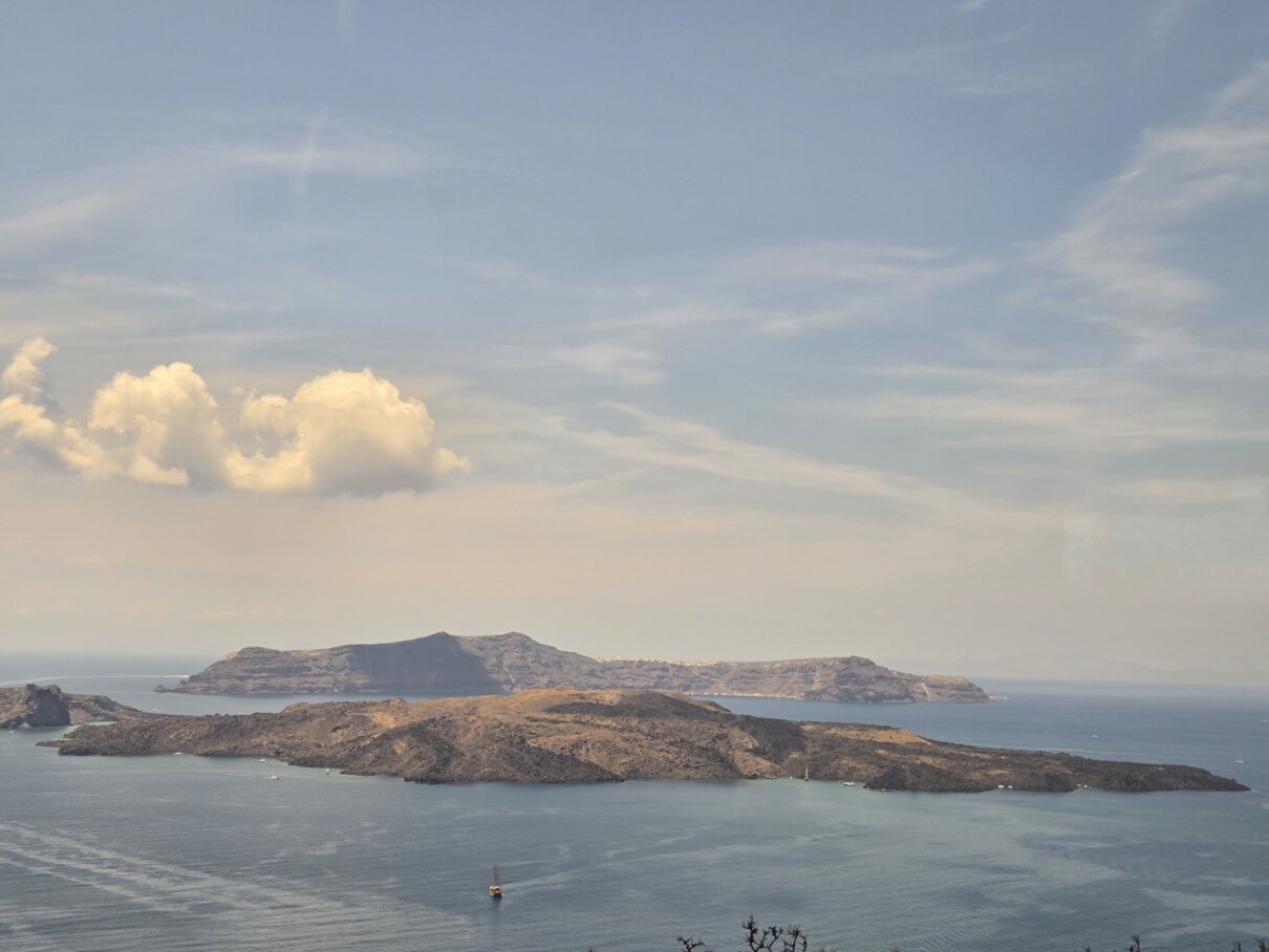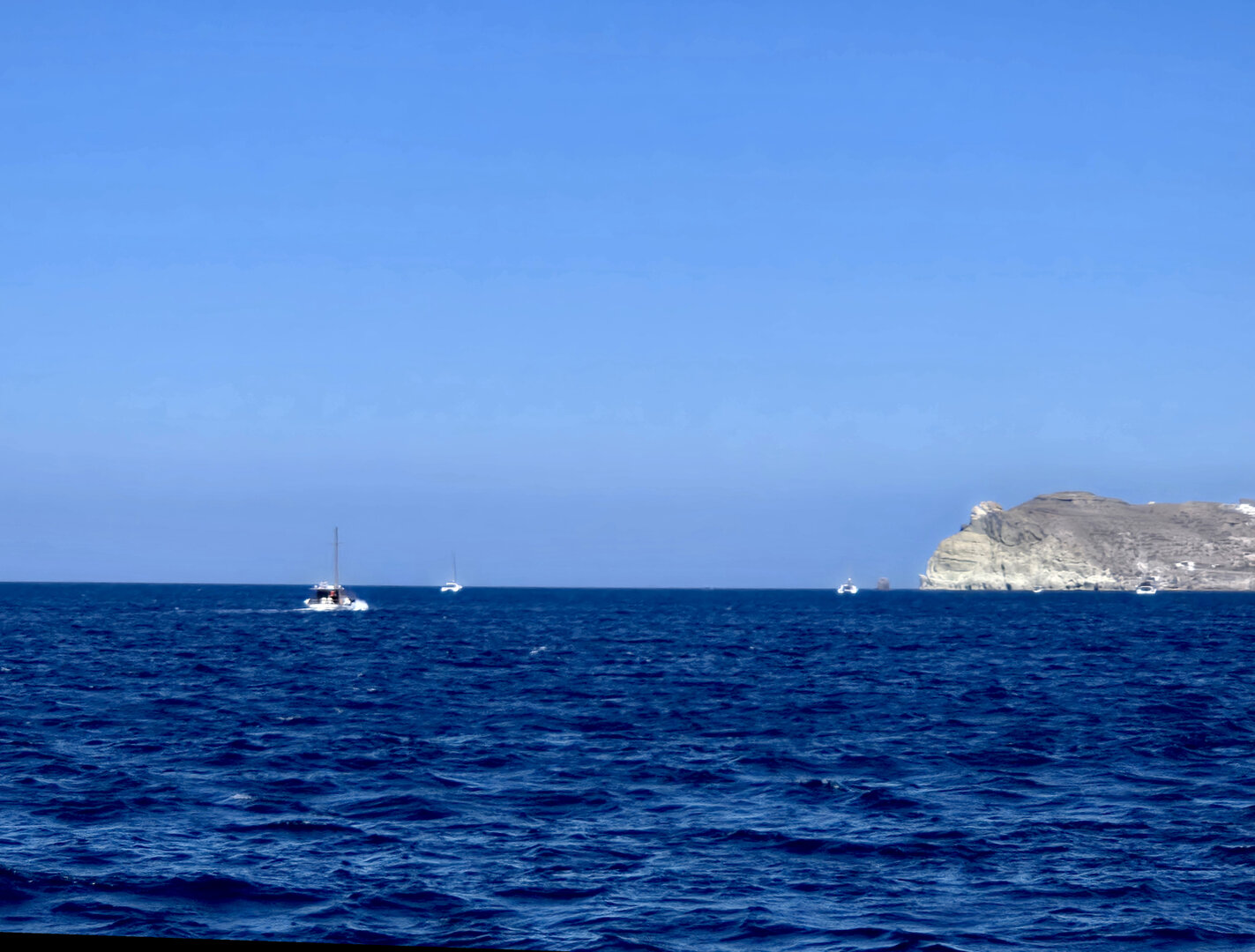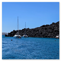 Our final full day in Greece, we took a catamaran tour of Santorini.  When we left the dock for the first hour heading to a cove the wind was strong and being on the water a bit brisk.  Joyce was not a happy camper.  However, we arrived at the cove, the sun was out, the wind was gone and it was beautiful.  The trip back was much better too.