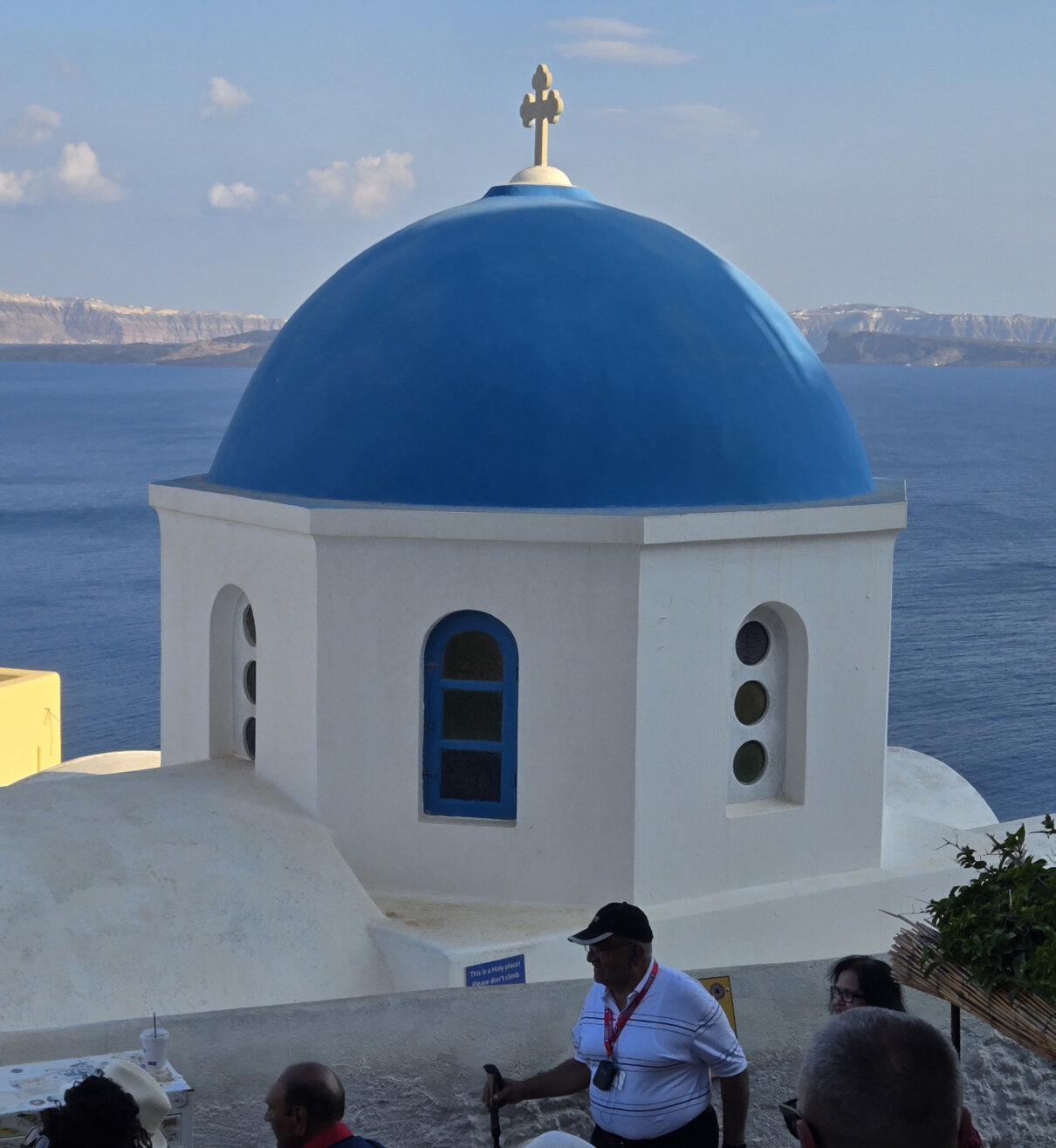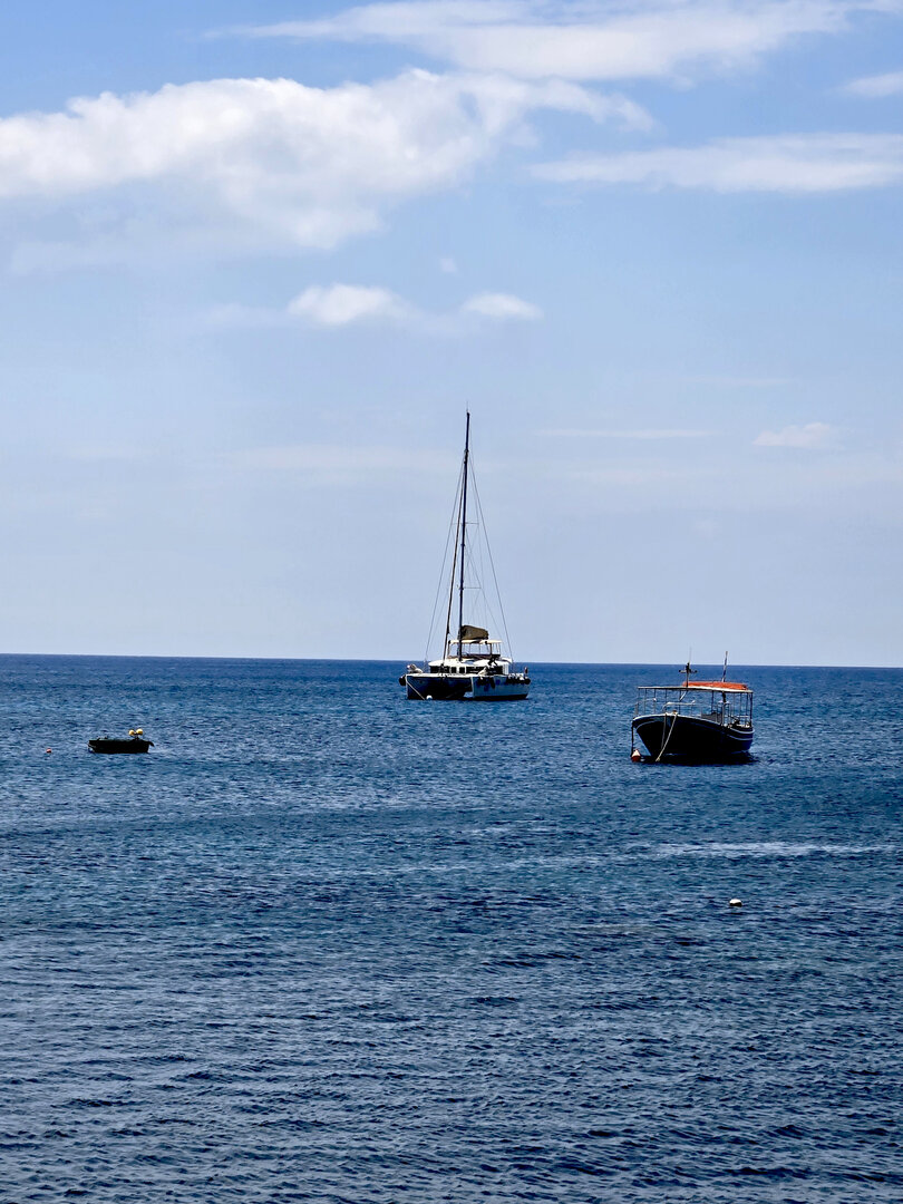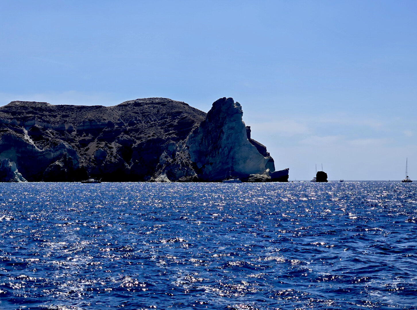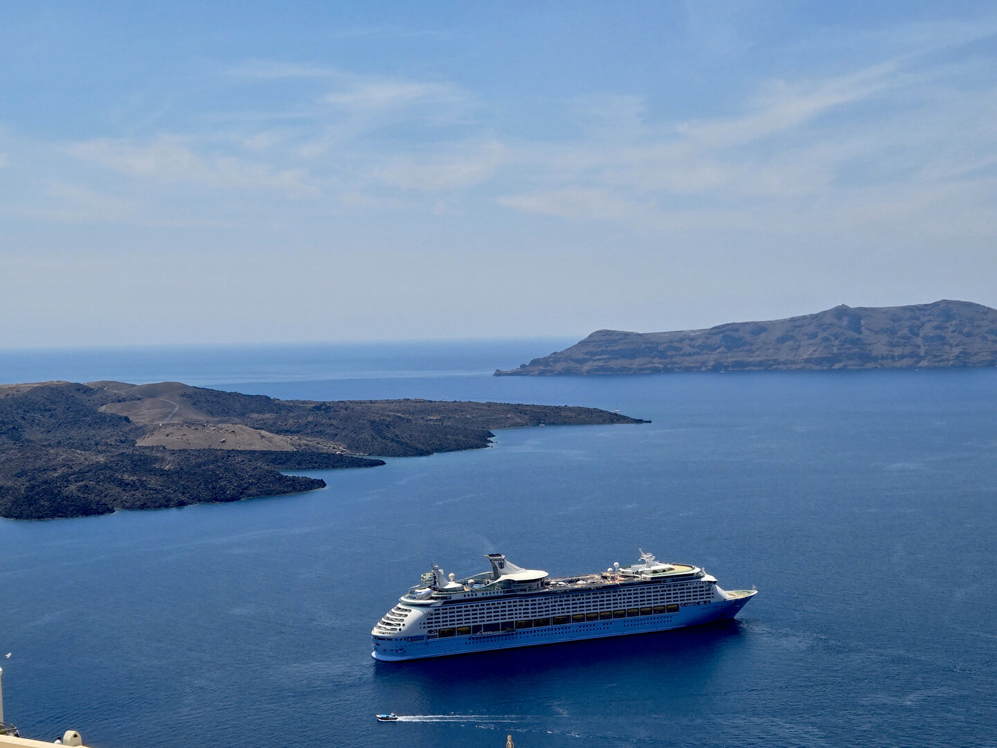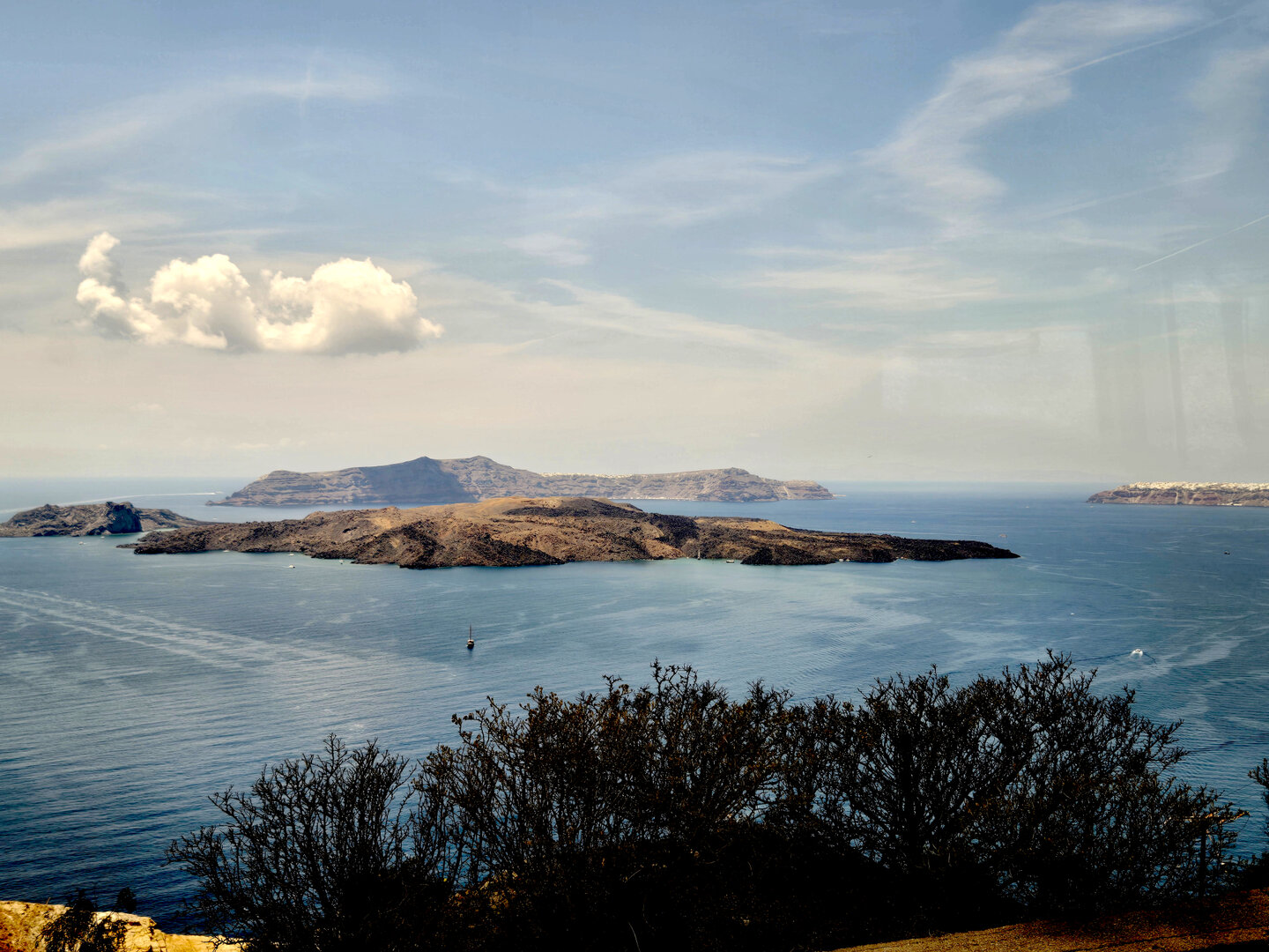 Our final full day in Greece, we took a catamaran tour of Santorini.  When we left the dock for the first hour heading to a cove the wind was strong and being on the water a bit brisk.  Joyce was not a happy camper.  However, we arrived at the cove, the sun was out, the wind was gone and it was beautiful.  The trip back was much better too.