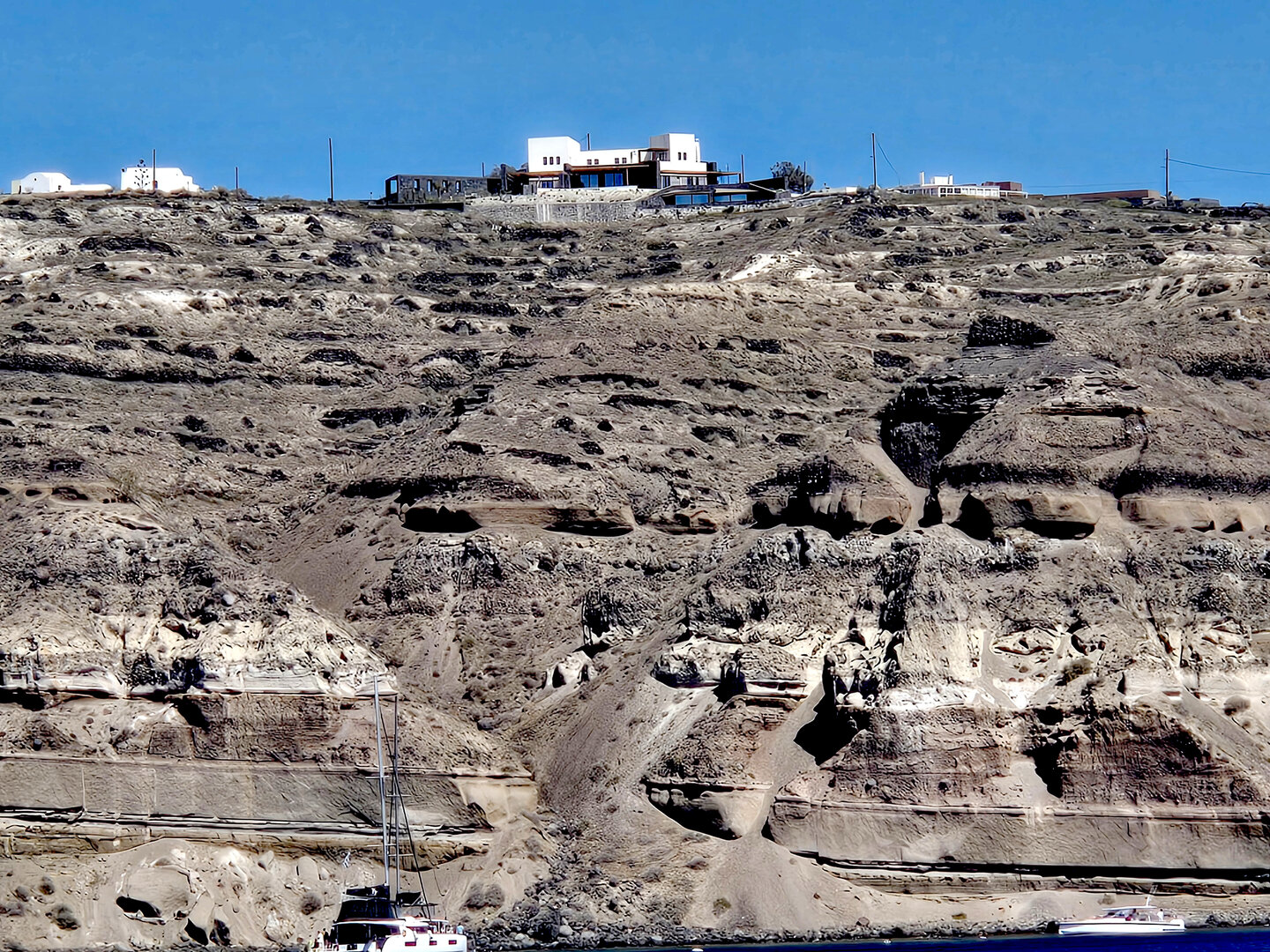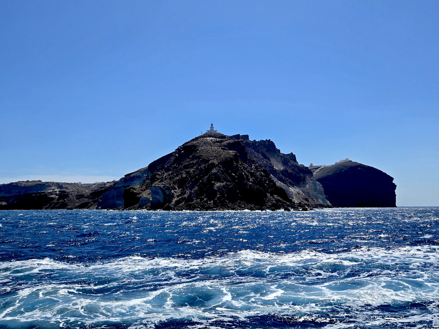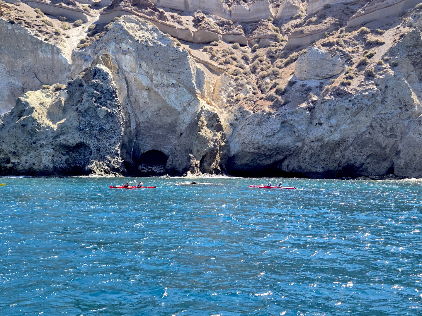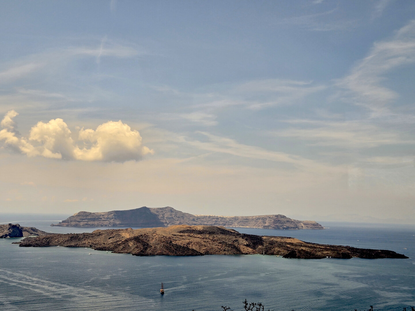 Our final full day in Greece, we took a catamaran tour of Santorini.  When we left the dock for the first hour heading to a cove the wind was strong and being on the water a bit brisk.  Joyce was not a happy camper.  However, we arrived at the cove, the sun was out, the wind was gone and it was beautiful.  The trip back was much better too.